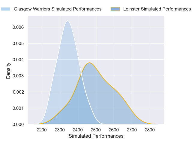 Each club has a rating and a rating deviation (similar to a Glicko rating), and expected performances can be generated. This allows for simulated matches and spreads like the ones below.