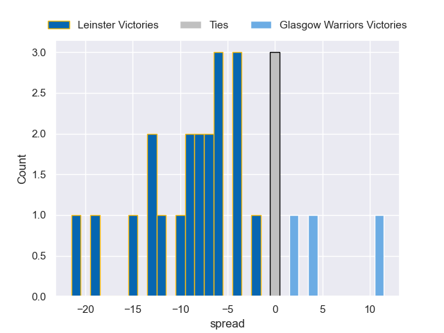 The first set of predictions treats a club as the smallest object, as the club develops its members, organizes a gameplan, and deploys its players as needed for each match. This club model is currently predicting Leinster to win by 6.38.