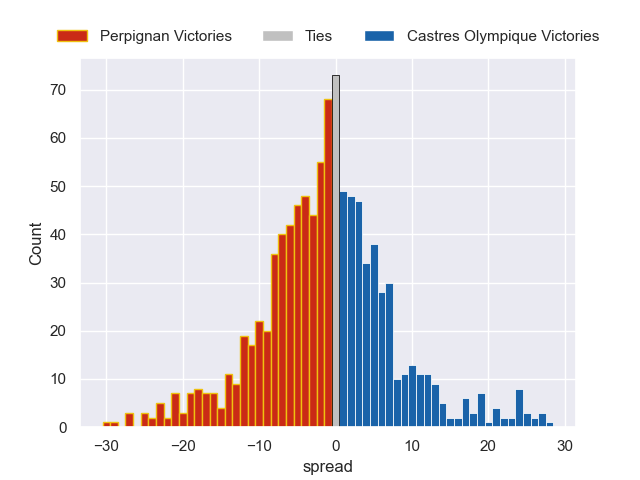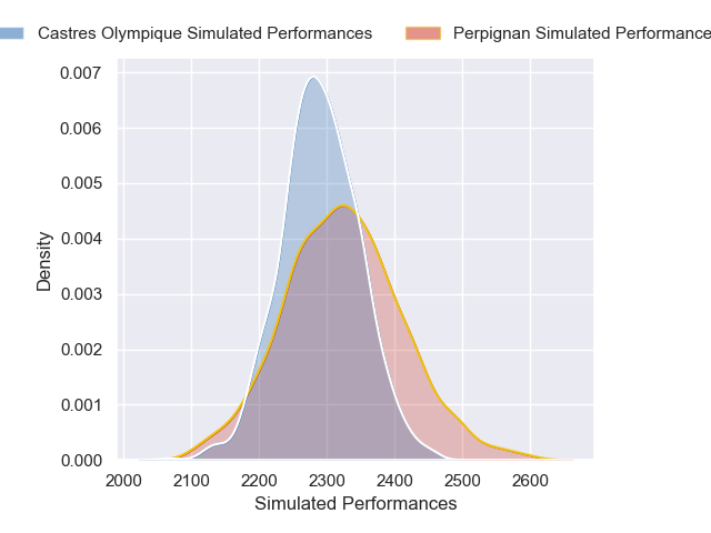 Each club has a rating and a rating deviation (similar to a Glicko rating), and expected performances can be generated. This allows for simulated matches and spreads like the ones below.