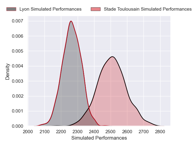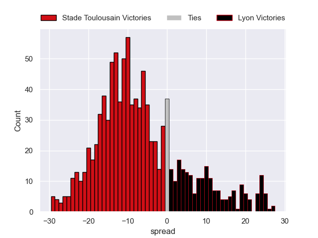 Each club has a rating and a rating deviation (similar to a Glicko rating), and expected performances can be generated. This allows for simulated matches and spreads like the ones below.