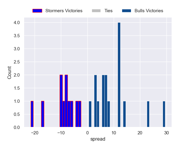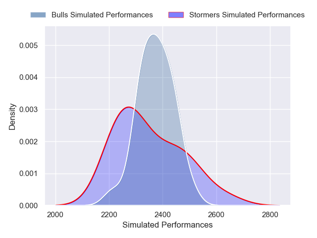 Each club has a rating and a rating deviation (similar to a Glicko rating), and expected performances can be generated. This allows for simulated matches and spreads like the ones below.