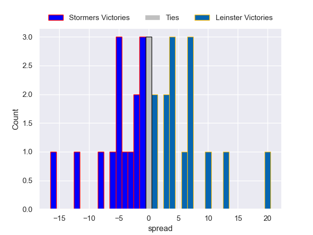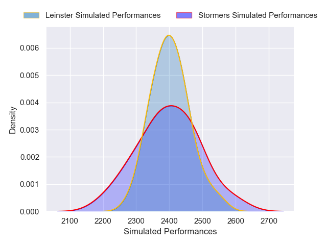 Each club has a rating and a rating deviation (similar to a Glicko rating), and expected performances can be generated. This allows for simulated matches and spreads like the ones below.