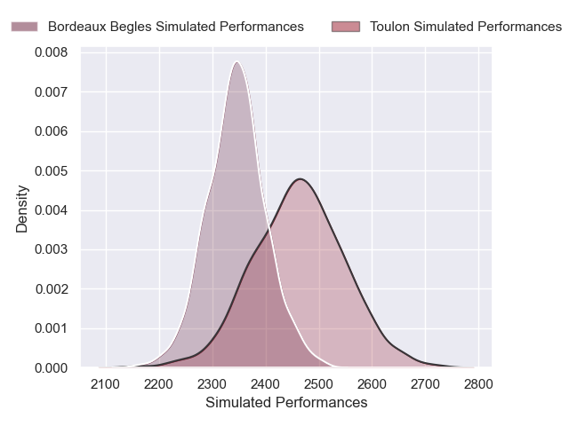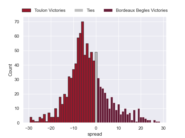 Each club has a rating and a rating deviation (similar to a Glicko rating), and expected performances can be generated. This allows for simulated matches and spreads like the ones below.
