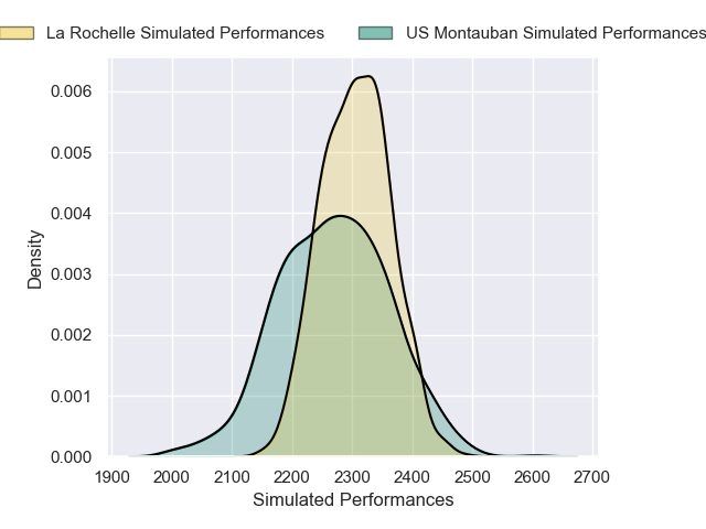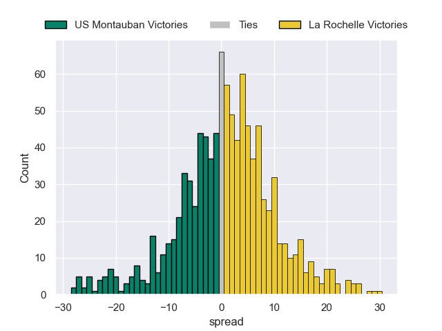 Each club has a rating and a rating deviation (similar to a Glicko rating), and expected performances can be generated. This allows for simulated matches and spreads like the ones below.