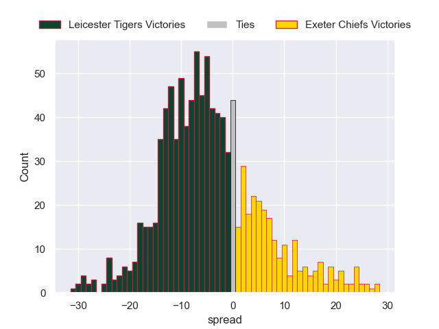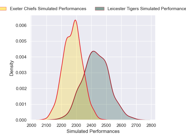 Each club has a rating and a rating deviation (similar to a Glicko rating), and expected performances can be generated. This allows for simulated matches and spreads like the ones below.