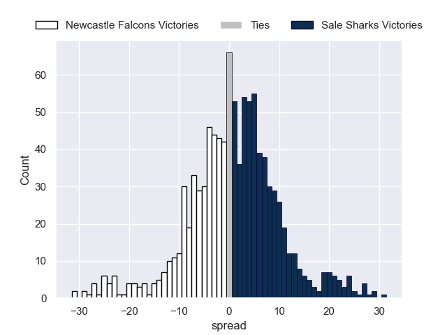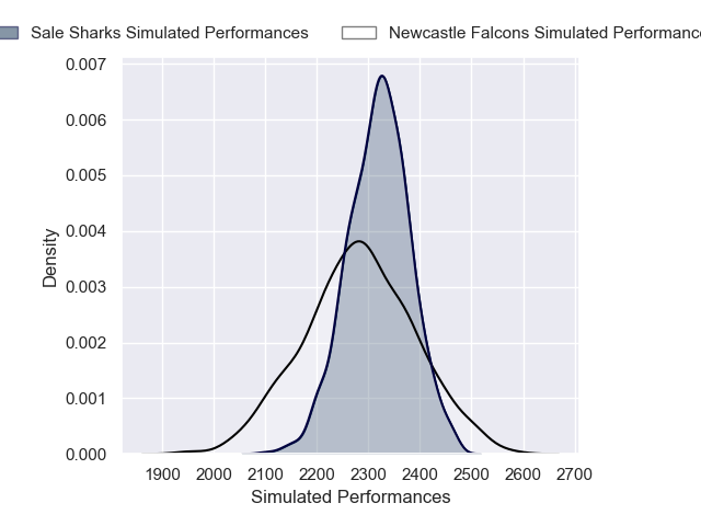 Each club has a rating and a rating deviation (similar to a Glicko rating), and expected performances can be generated. This allows for simulated matches and spreads like the ones below.