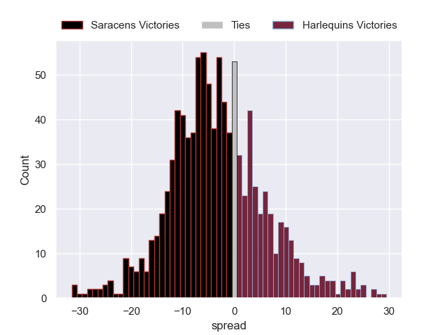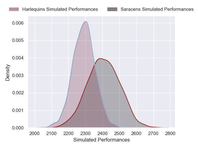 Each club has a rating and a rating deviation (similar to a Glicko rating), and expected performances can be generated. This allows for simulated matches and spreads like the ones below.