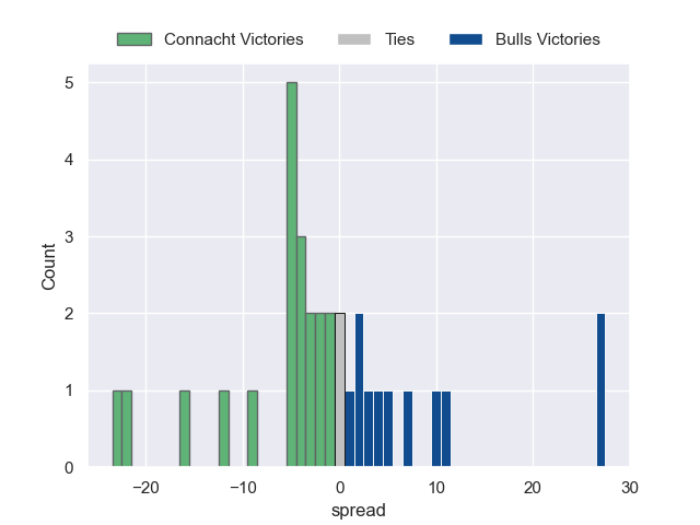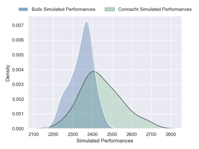 Each club has a rating and a rating deviation (similar to a Glicko rating), and expected performances can be generated. This allows for simulated matches and spreads like the ones below.