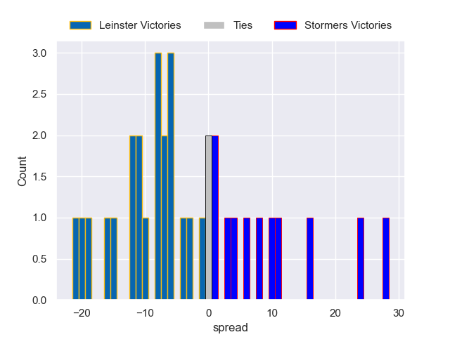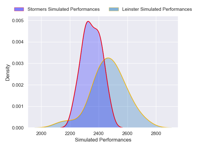 Each club has a rating and a rating deviation (similar to a Glicko rating), and expected performances can be generated. This allows for simulated matches and spreads like the ones below.