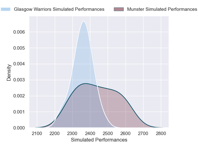 Each club has a rating and a rating deviation (similar to a Glicko rating), and expected performances can be generated. This allows for simulated matches and spreads like the ones below.