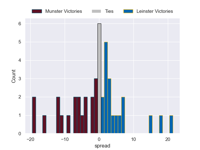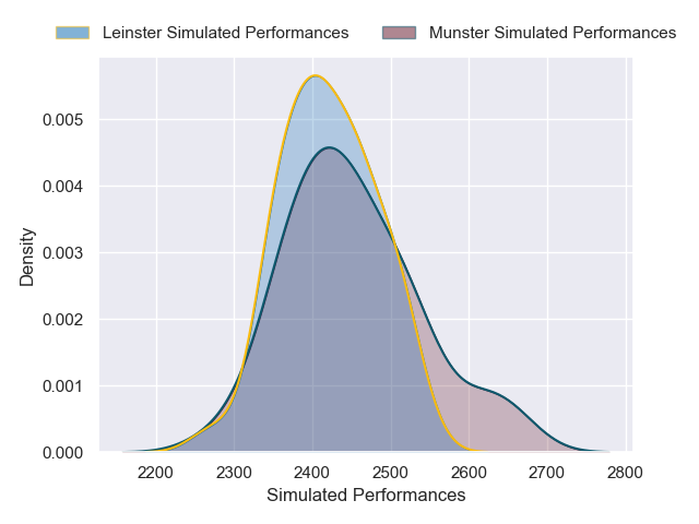 Each club has a rating and a rating deviation (similar to a Glicko rating), and expected performances can be generated. This allows for simulated matches and spreads like the ones below.