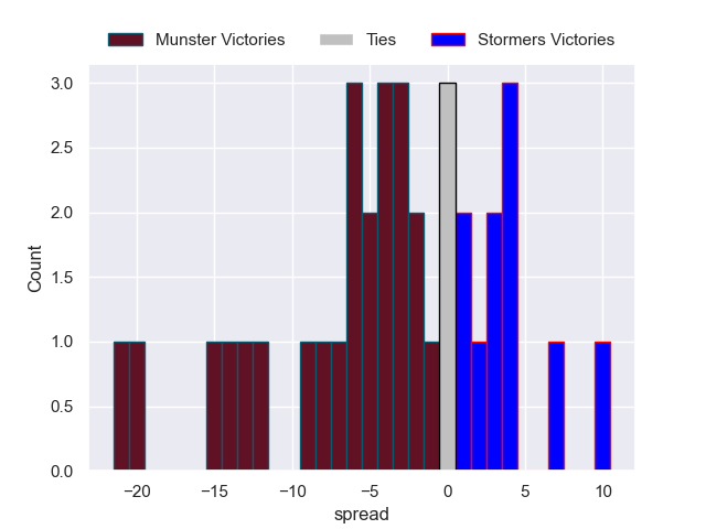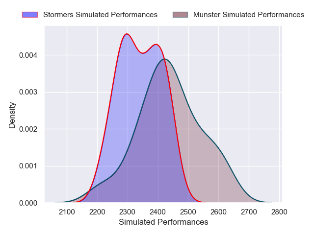 Each club has a rating and a rating deviation (similar to a Glicko rating), and expected performances can be generated. This allows for simulated matches and spreads like the ones below.