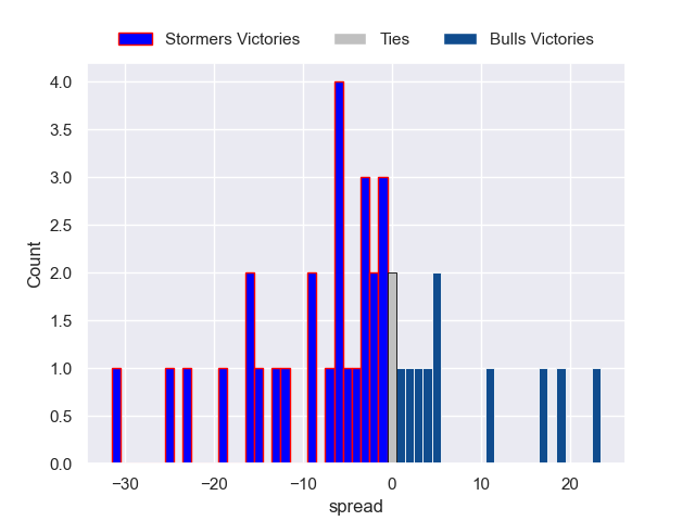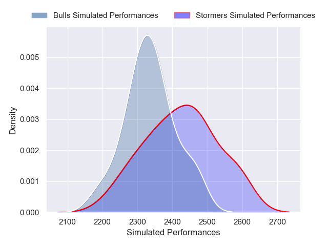 Each club has a rating and a rating deviation (similar to a Glicko rating), and expected performances can be generated. This allows for simulated matches and spreads like the ones below.