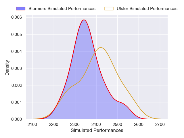 Each club has a rating and a rating deviation (similar to a Glicko rating), and expected performances can be generated. This allows for simulated matches and spreads like the ones below.