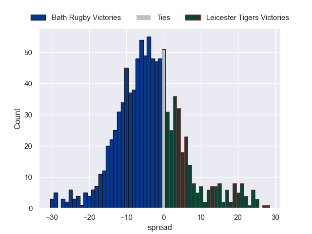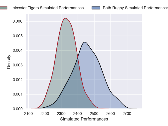 Each club has a rating and a rating deviation (similar to a Glicko rating), and expected performances can be generated. This allows for simulated matches and spreads like the ones below.