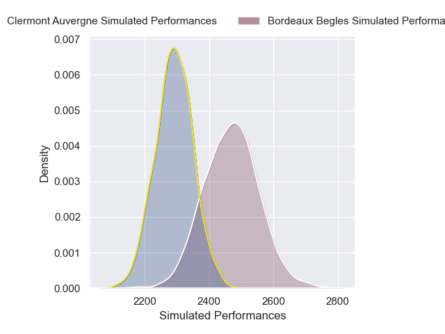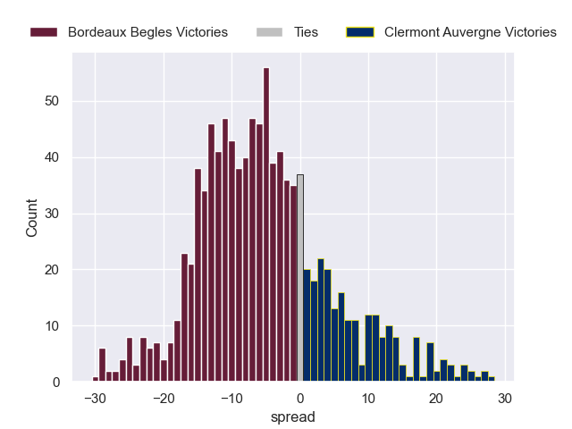 Each club has a rating and a rating deviation (similar to a Glicko rating), and expected performances can be generated. This allows for simulated matches and spreads like the ones below.