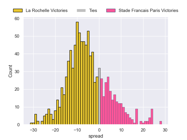 Each club has a rating and a rating deviation (similar to a Glicko rating), and expected performances can be generated. This allows for simulated matches and spreads like the ones below.