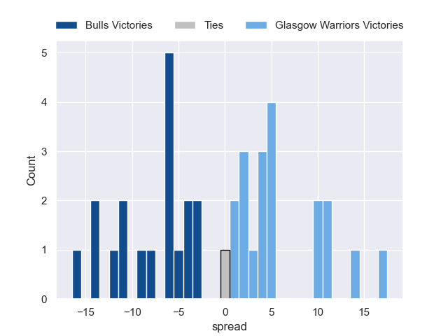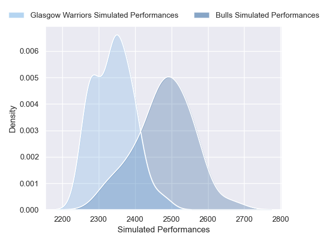 Each club has a rating and a rating deviation (similar to a Glicko rating), and expected performances can be generated. This allows for simulated matches and spreads like the ones below.