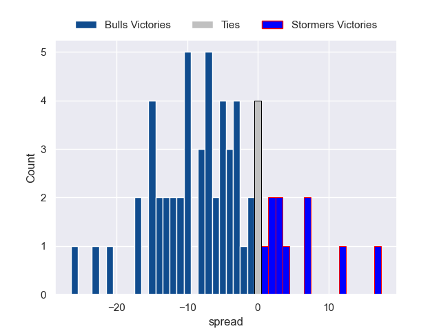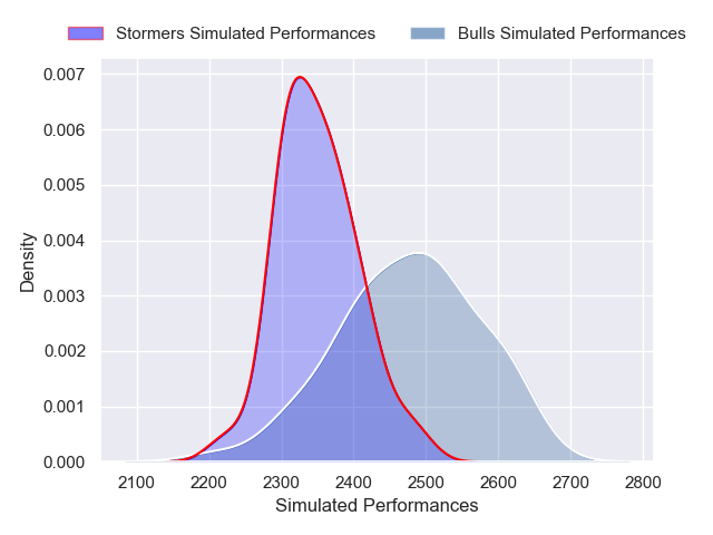 Each club has a rating and a rating deviation (similar to a Glicko rating), and expected performances can be generated. This allows for simulated matches and spreads like the ones below.