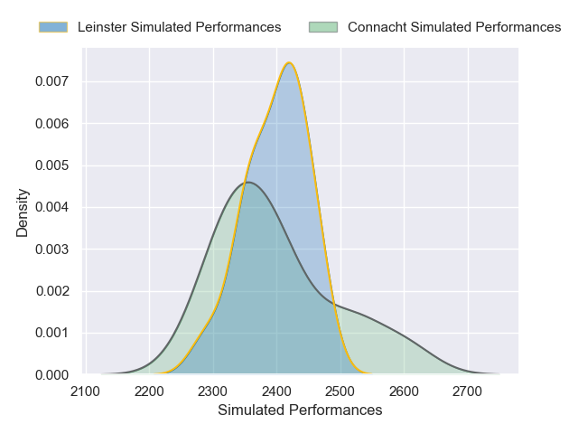 Each club has a rating and a rating deviation (similar to a Glicko rating), and expected performances can be generated. This allows for simulated matches and spreads like the ones below.