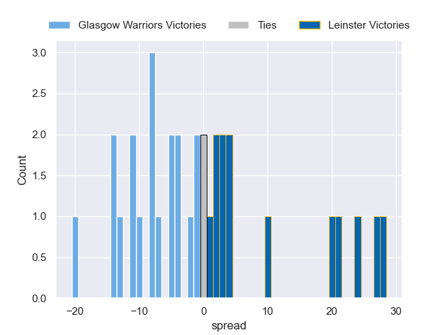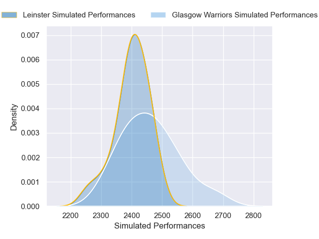 Each club has a rating and a rating deviation (similar to a Glicko rating), and expected performances can be generated. This allows for simulated matches and spreads like the ones below.