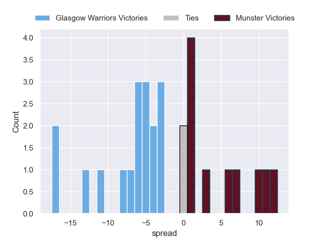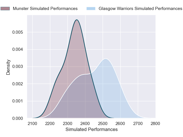 Each club has a rating and a rating deviation (similar to a Glicko rating), and expected performances can be generated. This allows for simulated matches and spreads like the ones below.