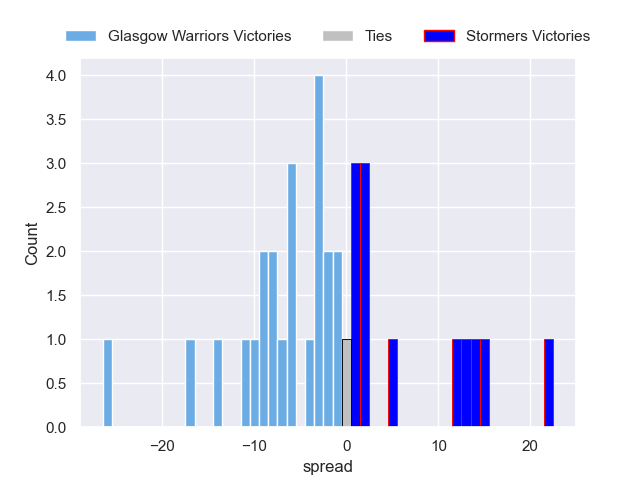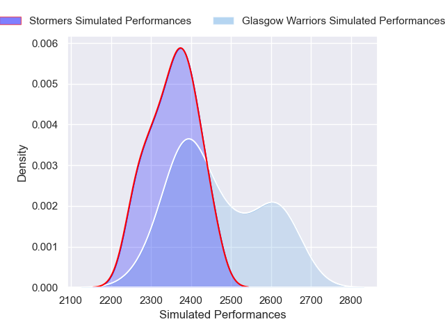 Each club has a rating and a rating deviation (similar to a Glicko rating), and expected performances can be generated. This allows for simulated matches and spreads like the ones below.