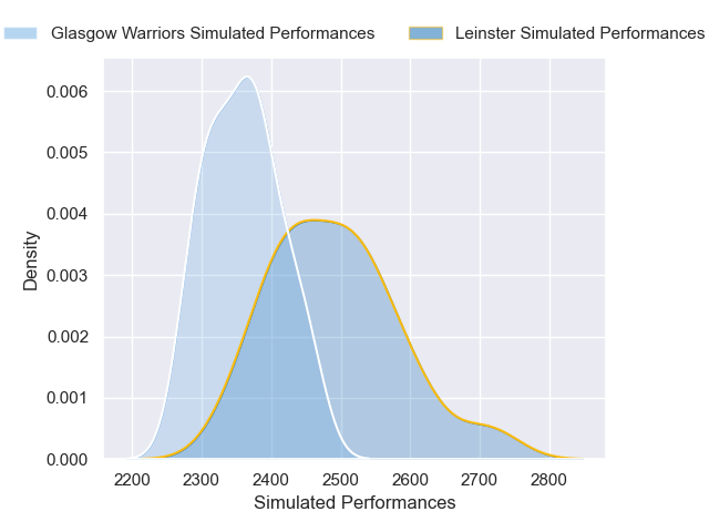 Each club has a rating and a rating deviation (similar to a Glicko rating), and expected performances can be generated. This allows for simulated matches and spreads like the ones below.