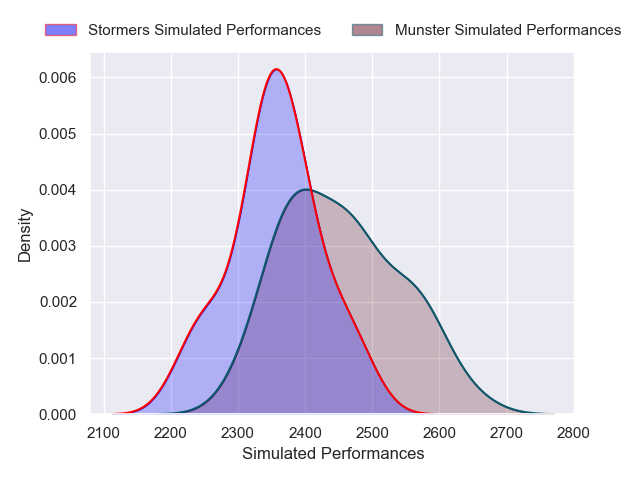 Each club has a rating and a rating deviation (similar to a Glicko rating), and expected performances can be generated. This allows for simulated matches and spreads like the ones below.