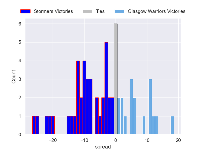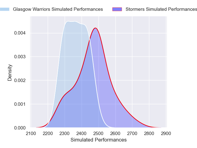 Each club has a rating and a rating deviation (similar to a Glicko rating), and expected performances can be generated. This allows for simulated matches and spreads like the ones below.