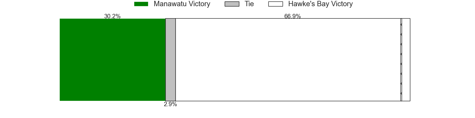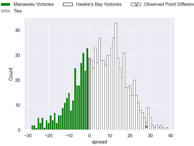 Now that the game has been played, lets see how the club predictions did. I predicted Hawke’s Bay to win by 5.78, and Hawke’s Bay won by 28.0. That’s an absolute error of 22.2 for the margin of victory, while my average absolute error has been 14.4 over the past six months. This prediction was more accurate than 20.2% of my recent predictions.