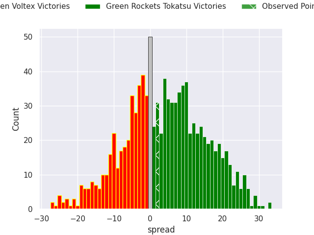 Now that the game has been played, lets see how the club predictions did. I predicted Green Rockets Tokatsu to win by 4.14, and Green Rockets Tokatsu won by 2.0. That’s an absolute error of 2.1 for the margin of victory, while my average absolute error has been 13.5 over the past six months. This prediction was more accurate than 88.6% of my recent predictions.