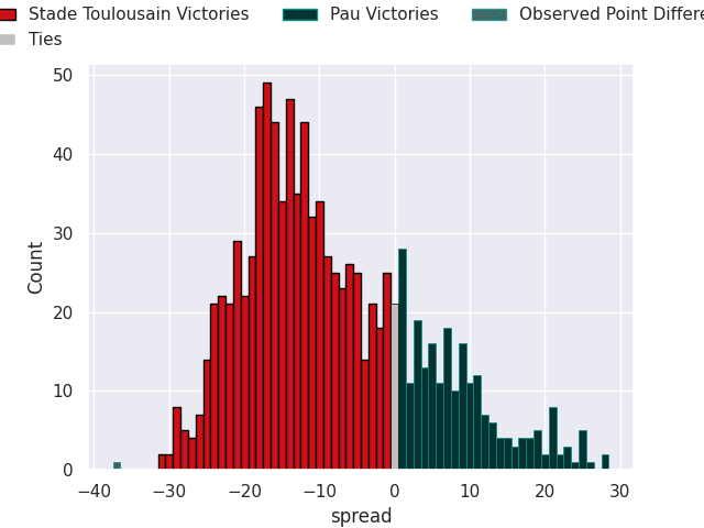Now that the game has been played, lets see how the club predictions did. I predicted Stade Toulousain to win by 8.43, and Stade Toulousain won by 37.0. That’s an absolute error of 28.6 for the margin of victory, while my average absolute error has been 13.5 over the past six months. This prediction was more accurate than 11.3% of my recent predictions.
