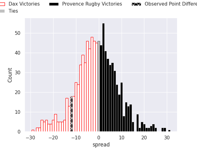 Now that the game has been played, lets see how the club predictions did. I predicted Dax to win by 0.92, and Dax won by 12.0. That’s an absolute error of 11.1 for the margin of victory, while my average absolute error has been 13.5 over the past six months. This prediction was more accurate than 45.6% of my recent predictions.