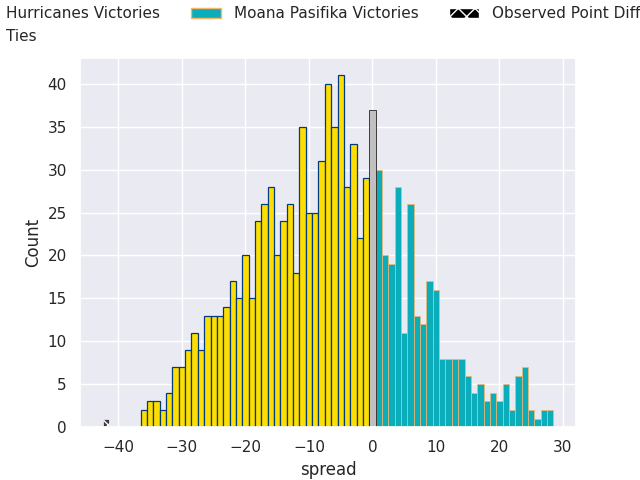 Now that the game has been played, lets see how the club predictions did. I predicted Hurricanes to win by 6.56, and Hurricanes won by 42.0. That’s an absolute error of 35.4 for the margin of victory, while my average absolute error has been 13.5 over the past six months. This prediction was more accurate than 5.9% of my recent predictions.