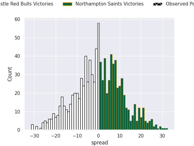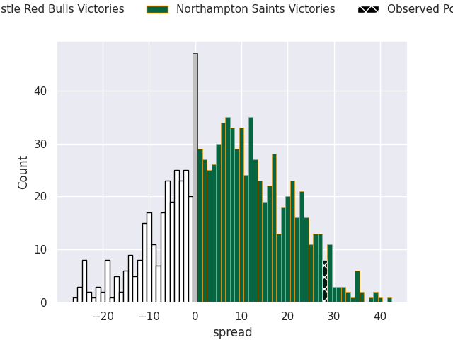 Now that the game has been played, lets see how the club predictions did. I predicted Northampton Saints to win by 7.02, and Northampton Saints won by 28.0. That’s an absolute error of 21.0 for the margin of victory, while my average absolute error has been 13.5 over the past six months. This prediction was more accurate than 21.1% of my recent predictions.