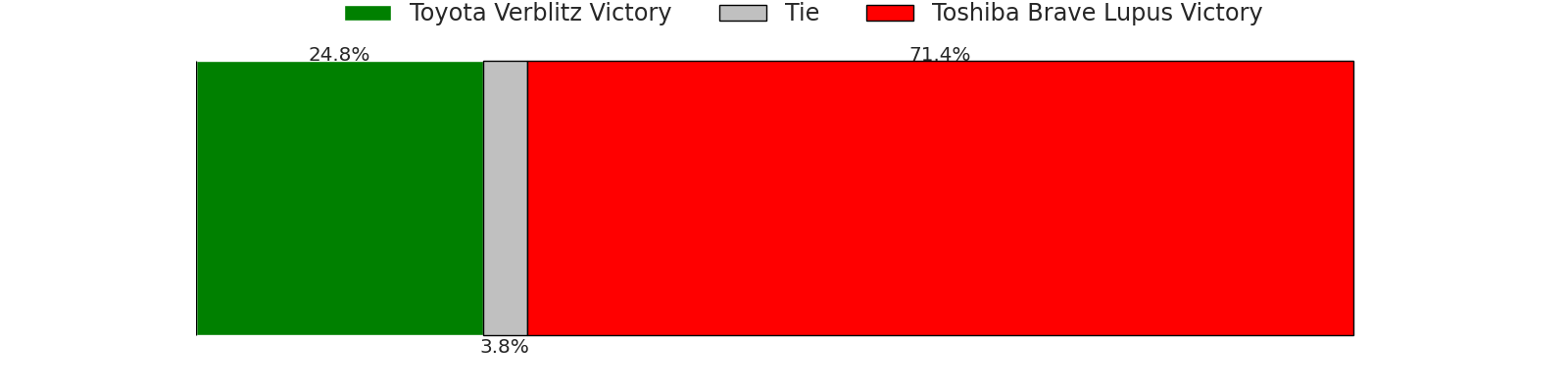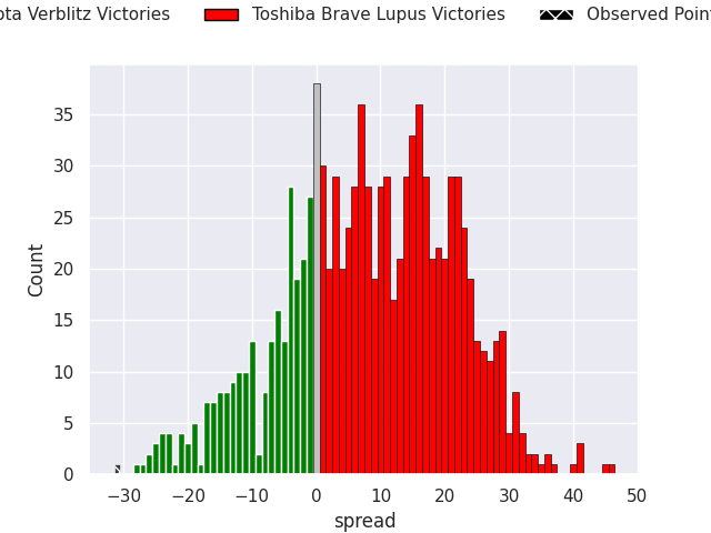 Now that the game has been played, lets see how the club predictions did. I predicted Toshiba Brave Lupus to win by 8.26, and Toyota Verblitz won by 31.0. That’s an absolute error of 39.3 for the margin of victory, while my average absolute error has been 13.5 over the past six months. This prediction was more accurate than 4.7% of my recent predictions.