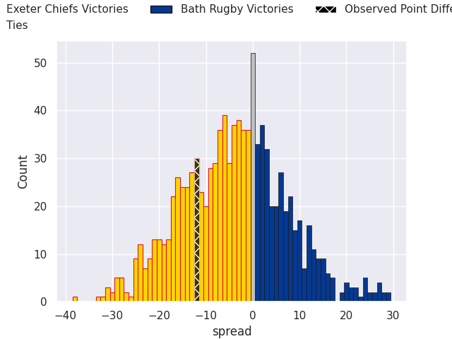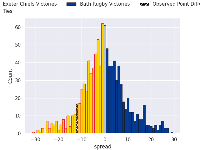 Now that the game has been played, lets see how the club predictions did. I predicted Exeter Chiefs to win by 0.46, and Exeter Chiefs won by 12.0. That’s an absolute error of 11.5 for the margin of victory, while my average absolute error has been 13.5 over the past six months. This prediction was more accurate than 44.1% of my recent predictions.