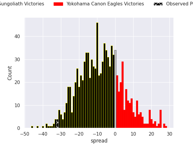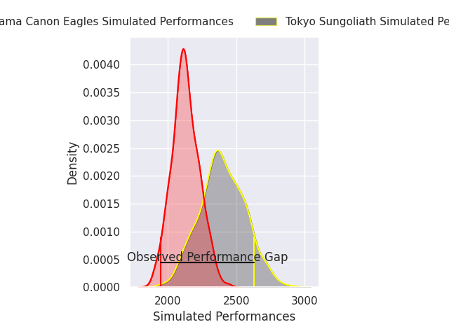 Now that the game has been played, lets see how the club predictions did. I predicted Tokyo Sungoliath to win by 7.86, and Tokyo Sungoliath won by 32.0. That’s an absolute error of 24.1 for the margin of victory, while my average absolute error has been 13.5 over the past six months. This prediction was more accurate than 16.2% of my recent predictions.