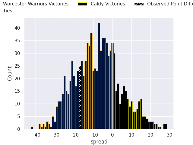 Now that the game has been played, lets see how the club predictions did. I predicted Worcester Warriors to win by 7.73, and Worcester Warriors won by 17.0. That’s an absolute error of 9.3 for the margin of victory, while my average absolute error has been 13.5 over the past six months. This prediction was more accurate than 52.4% of my recent predictions.
