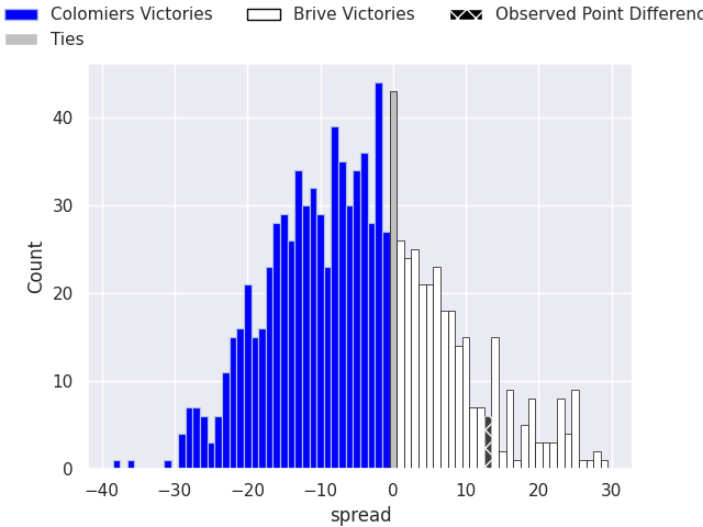 Now that the game has been played, lets see how the club predictions did. I predicted Colomiers to win by 6.53, and Brive won by 13.0. That’s an absolute error of 19.5 for the margin of victory, while my average absolute error has been 13.2 over the past six months. This prediction was more accurate than 23.0% of my recent predictions.