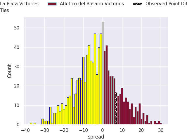 Now that the game has been played, lets see how the club predictions did. I predicted La Plata to win by 2.81, and Atletico del Rosario won by 7.0. That’s an absolute error of 9.8 for the margin of victory, while my average absolute error has been 13.3 over the past six months. This prediction was more accurate than 51.1% of my recent predictions.