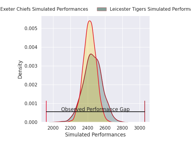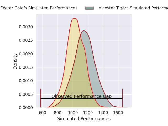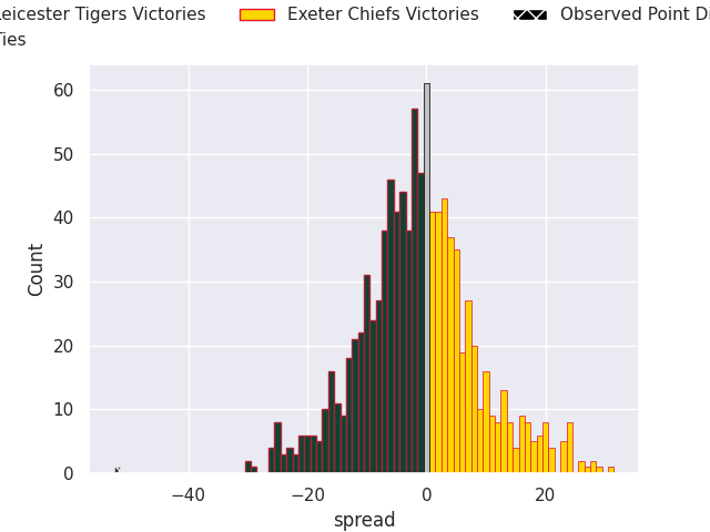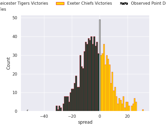 Now that the game has been played, lets see how the club predictions did. I predicted Leicester Tigers to win by 1.4, and Leicester Tigers won by 52.0. That’s an absolute error of 50.6 for the margin of victory, while my average absolute error has been 13.3 over the past six months. This prediction was more accurate than 1.2% of my recent predictions.