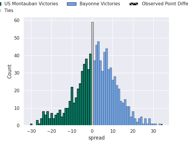 Now that the game has been played, lets see how the club predictions did. I predicted Bayonne to win by 1.97, and Bayonne won by 34.0. That’s an absolute error of 32.0 for the margin of victory, while my average absolute error has been 13.4 over the past six months. This prediction was more accurate than 8.1% of my recent predictions.