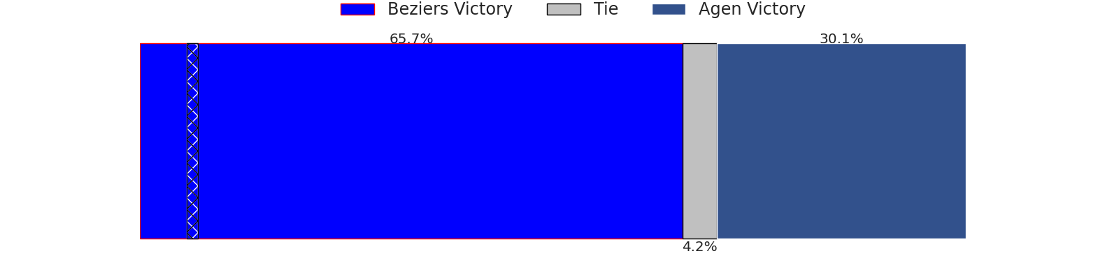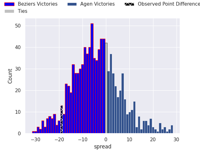 With the player model, I predicted Beziers to win by 3.99, and Beziers won by 19.0. That’s an absolute error of 15.0 for the margin of victory, while the average error as been 13.2 for the past six months. So this prediction was more accurate than 27.0% of my recent predictions.