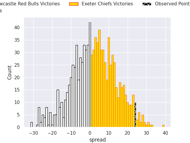 Now that the game has been played, lets see how the club predictions did. I predicted Exeter Chiefs to win by 7.16, and Exeter Chiefs won by 24.0. That’s an absolute error of 16.8 for the margin of victory, while my average absolute error has been 13.5 over the past six months. This prediction was more accurate than 29.2% of my recent predictions.