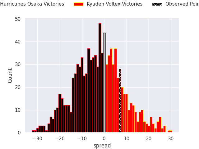 Now that the game has been played, lets see how the club predictions did. I predicted Red Hurricanes Osaka to win by 2.45, and Kyuden Voltex won by 7.0. That’s an absolute error of 9.4 for the margin of victory, while my average absolute error has been 13.5 over the past six months. This prediction was more accurate than 52.7% of my recent predictions.