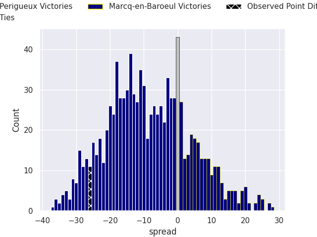 With the player model, I predicted Perigueux to win by 8.36, and Perigueux won by 26.0. That’s an absolute error of 17.6 for the margin of victory, while the average error as been 13.2 for the past six months. So this prediction was more accurate than 21.8% of my recent predictions.