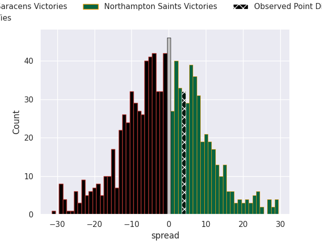 Now that the game has been played, lets see how the club predictions did. I predicted Saracens to win by 0.7, and Northampton Saints won by 4.0. That’s an absolute error of 4.7 for the margin of victory, while my average absolute error has been 13.5 over the past six months. This prediction was more accurate than 76.2% of my recent predictions.