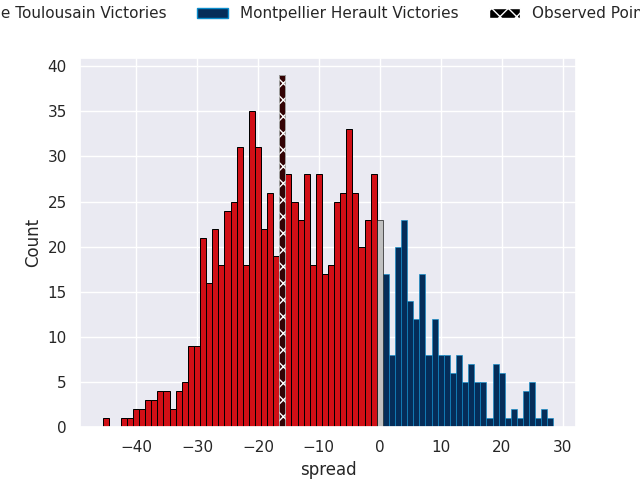Now that the game has been played, lets see how the club predictions did. I predicted Stade Toulousain to win by 7.24, and Stade Toulousain won by 16.0. That’s an absolute error of 8.8 for the margin of victory, while my average absolute error has been 13.5 over the past six months. This prediction was more accurate than 55.5% of my recent predictions.
